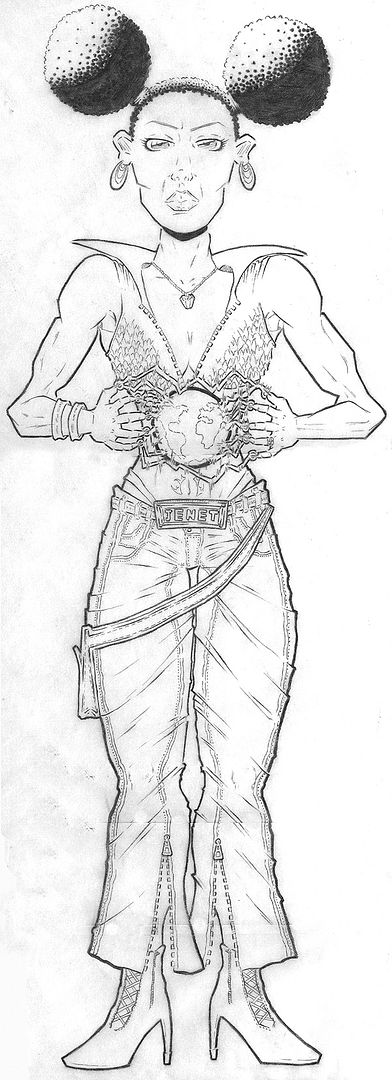 Did this for a home girl in 2003 but before I could finish it she left the state and I had not herd form her since. In 2005 I was looking in my portfolio and found it. I decided to finish it up because I just don’t like half done work that was not meant to be done half way. As you see, its a pretty lady all Diva out. The hair the clothing and the shoe’s she picked out in a magazine, she says the would is hers, that’s why a globe is in her hand.