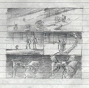 Last but not lease the details, start carving the details into the robot like a statue. Just take out a slice of tracing paper and start adding small stuff like in grooves, out grooves, wires, vents, screws, and most important of all, were and tare, a details all artists should find an excuse to add. Don’t forget line weight please. This should take less then two hours. Its alive, I call it the monkey juice bot!